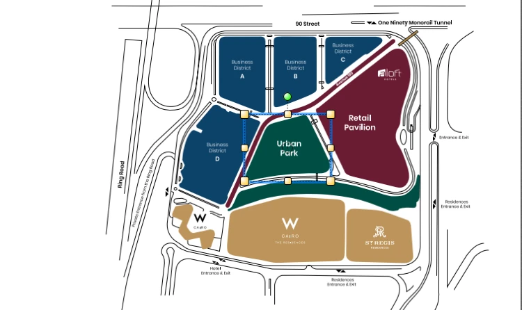 شبكة مواصلات داخلية بالمونوريل: يضم المشروع خط مونوريل داخلي يسهل التنقل بين مباني المشروع بكل راحة وسهولة.