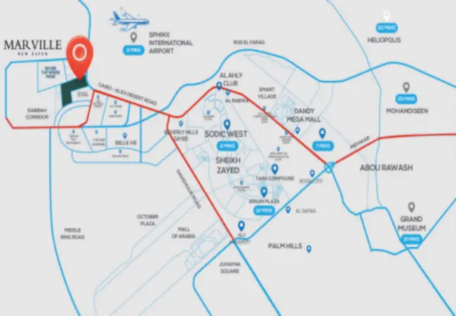 يقع مارفيل نيو زايد على طريق القاهرة-الإسكندرية الصحراوي مباشرة، ويبعد دقائق قليلة عن مطار سفنكس، مما يضمن سهولة الوصول والتنقل. يتميز الموقع بقربه من المراكز التجارية والخدمات الأساسية، مثل هايبر وان وعدد من المطاعم والمقاهي، كما يبعد حوالي 20 دقيقة فقط عن منطقة المهندسين بالقاهرة، لتسهيل التنقل اليومي بين المدينة والكمبوند.