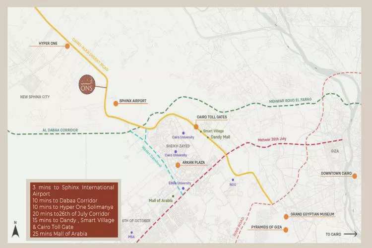 ONS New Zayed enjoys an exceptional strategic location at Kilo 48 on the Cairo–Alexandria Desert Road, directly facing Sphinx International Airport, making it one of the most prestigious developments in the entire New Zayed area.