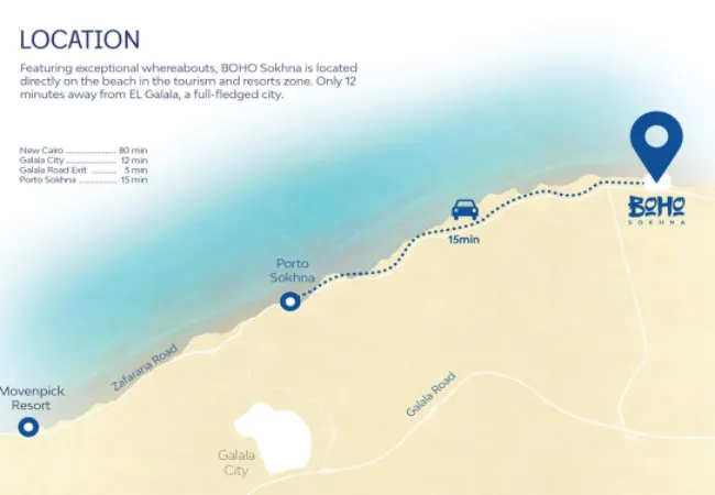 Boho Ain Sokhna Village boasts a highly strategic and attractive location in the heart of Ain Sokhna, making it an easily accessible destination close to key routes:
